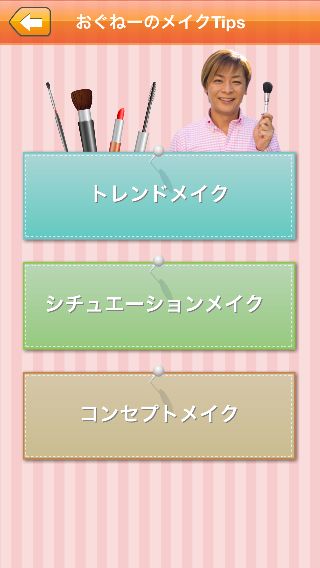 「おぐねーのメイクTips」では、メイクの種類ごとにおぐねーとっておきのメイクテクニックを見る事ができる。