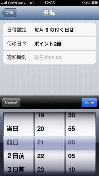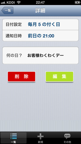 「毎月○の付く日は○○の日」では、例えば5日に設定すると毎月5日・15日・25日の当日~10日前の間で設定したタイミングでお知らせ通知が届く。