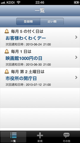 登録したリマインダーは一覧で確認でき、「登録順」「近い順」で並び替えられる。