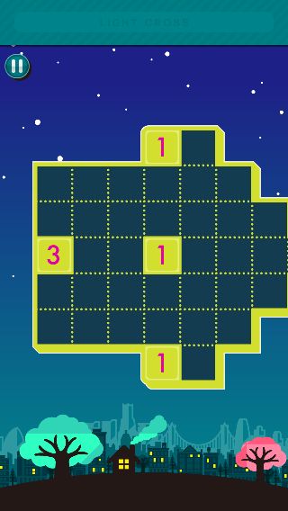 光線の通ったマスは明るくなるので、他のマスを埋めていく事で新たに「電球」を置ける場所が確定していく。