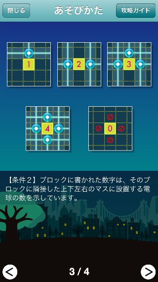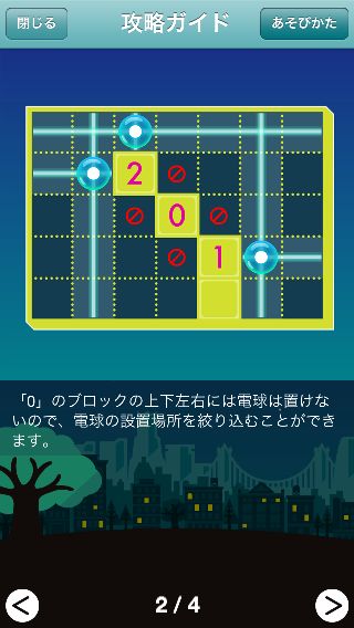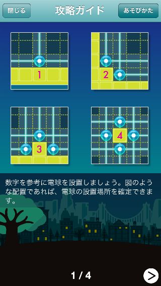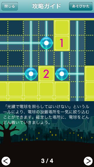 攻略のコツは、まず「電球」を置く場所が確定されているマスから攻めていく。