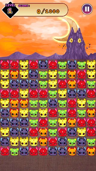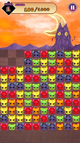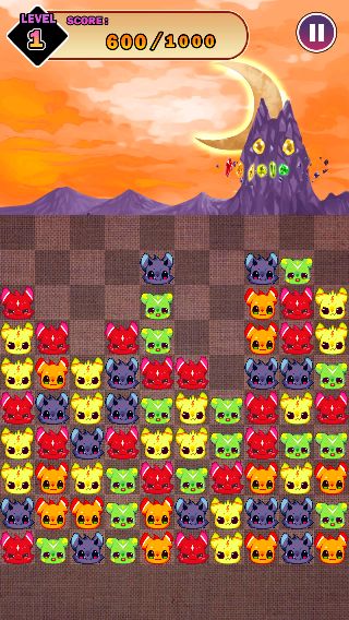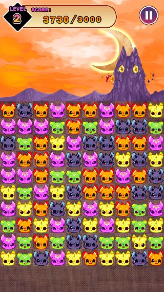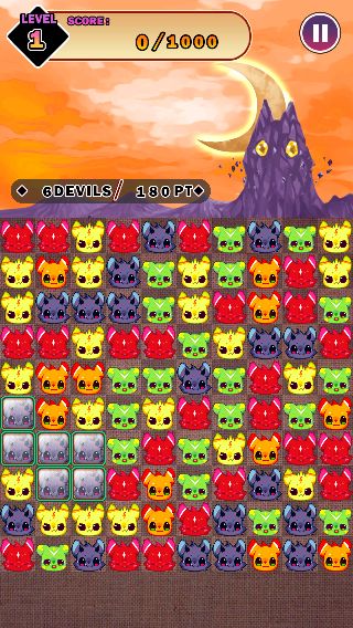 2匹以上隣り合った「にゃんこでびる」をタップで消して、あくまの砦を封印するのが目的の『さめがめ』系のパズルゲーム。