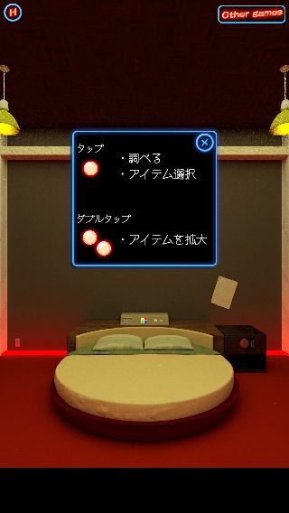 脱出ゲーム「Rolling Bed」 無料 0 評価する 送信する 舞台はどこかの街のどこかのホテル。 ふと意識の戻ったあなたは、 回転ベッドが鎮座する一室に閉じ込められていた…… なぜ閉じ込められたのか。 そしてここはどこなのか。 その謎は脱出すればわかるはず!? ※ 公開停止 3Dグラフィックで表現された、ホテルの室内からの脱出ゲーム。 気になる場所をタップして調べ、移動は左右にフリックする事で行う。 攻略その1 攻略その2 攻略その3 攻略その4 攻略その5