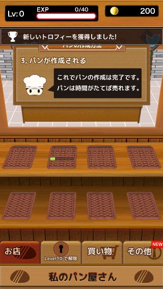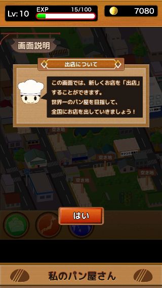 パン屋のオーナーとなって様々な種類のパンを作成して、様々な地域に店を出店していく放置系シミュレーションゲーム。