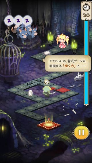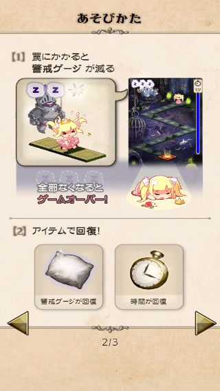 お助けアイテムは、ミスをして減った警戒ゲージを回復する「まくら」や、制限時間を3秒延長する「時計」がある。