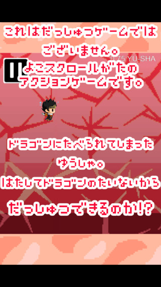 画面を長押しで浮かび上がる勇者を、障害物を避けながらひたすらドラゴンの体内を進んでいく「Flappy Bird」系のカジュアルアクションゲーム。
