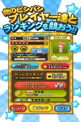 ビシキャラ毎にミニゲームを有利に遊べるスキルがそれぞれ設定されており、成長させるとスキルがどんどん強化されていくのだ。最強のビシキャラでハイスコアを叩き出し、友達や全国のプレイヤーとランキングで競いあおう!
