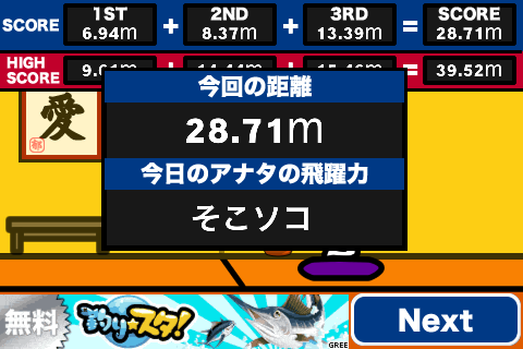 1回終わるごとに飛距離を表示。