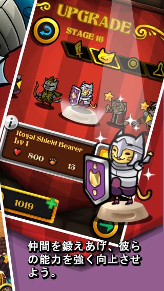 塔のあちらこちらで見つかる貴重なキャット・コインを拾って、部隊の能力アップに使い、邪悪なキング・ドラゴンとの戦いに備えよう。