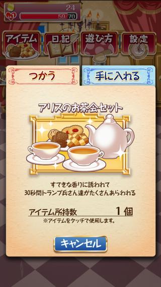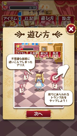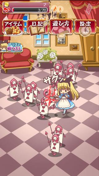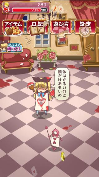 時間経過で湧いてくるトランプ兵やチェシャ猫と遊んで経験値とコインをゲットしよう。