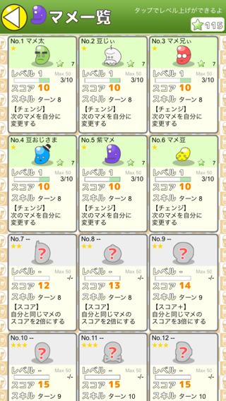 [ガチャ]や[ボスを倒す]ことで手に入るマメを集めてコンプリートしよう。