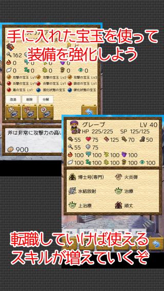 改造用のアイテム「宝玉」で装備を強化し、転職してスキルを増やしていくことによってチームをどんどん強くしていきましょう。