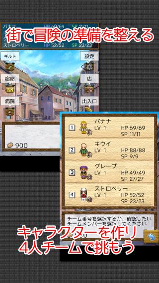 街のギルドで8つある職業からキャラクターを作成し、4人からなるチーム編成してダンジョン探索にいどみます。