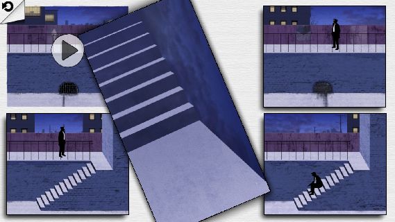 とある1場面では、主人公が追っ手から逃げて1コマずつ進んでいく。