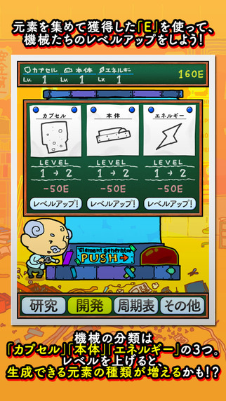 元素を集めて獲得した「E」を使って、機械たちのレベルアップをしよう!