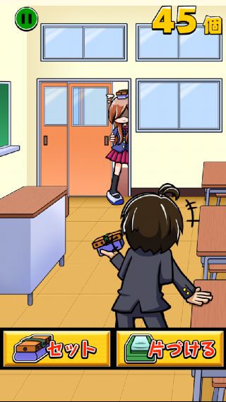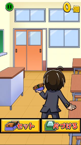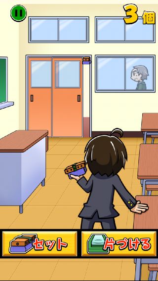 『片づける』ボタンを10回押すまでに何個の黒板消しをセットできるかを競う。