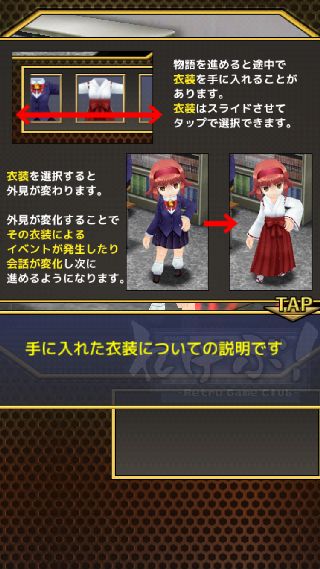 衣装を手に入れたら、着替える事でイベントが発生したり会話が変化するようになる。