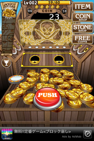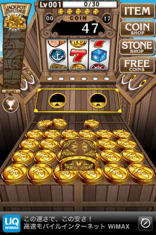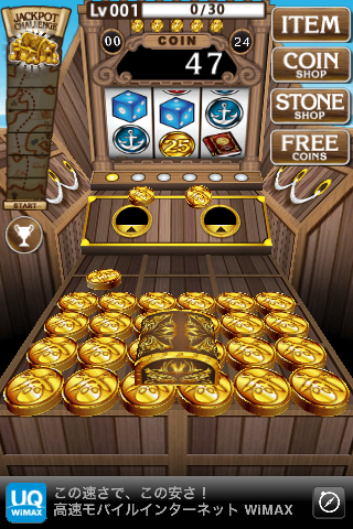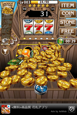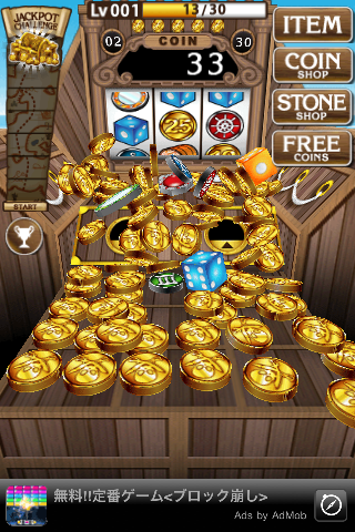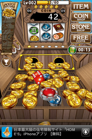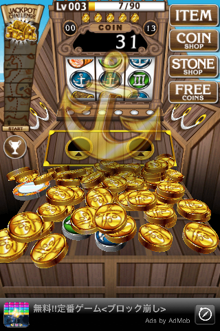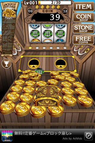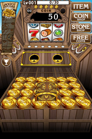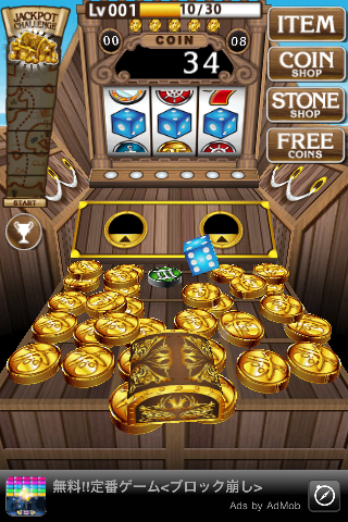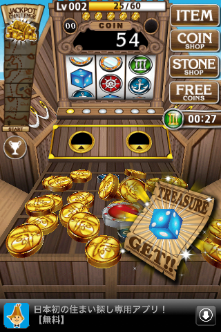 コインを投下してスロットを回しお宝をコレクションするコインプッシャーゲーム。