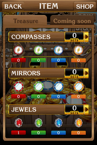 右上のメニューでは集めたお宝を確認したり、コインをアドオン課金で購入もできる。