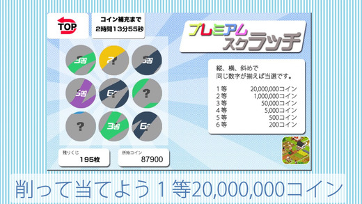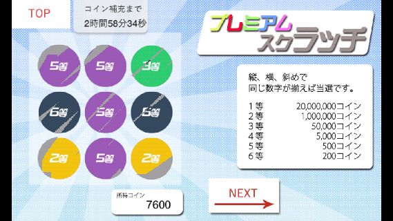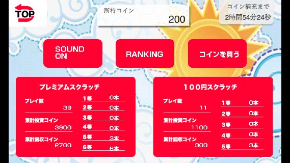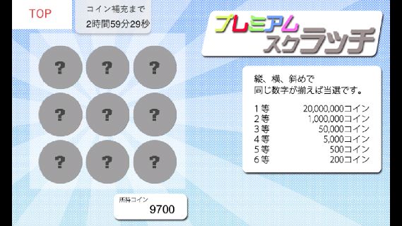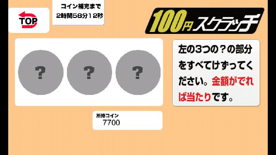 プレイできるスクラッチは、1回300コインの「プレミアムスクラッチ」と、1回100コインの「100円スクラッチ」の2つ。