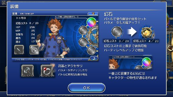 装備ではキャラクターごとに武器とアクセサリをセットでき、幻石スロットにバトルで使う魔法や技をセットする事でパラメータを上げる事ができる。