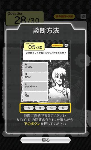 30問の心理テストを受けて、出された質問に適切だと思う解答(4択)の中から選んで答えていく。