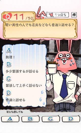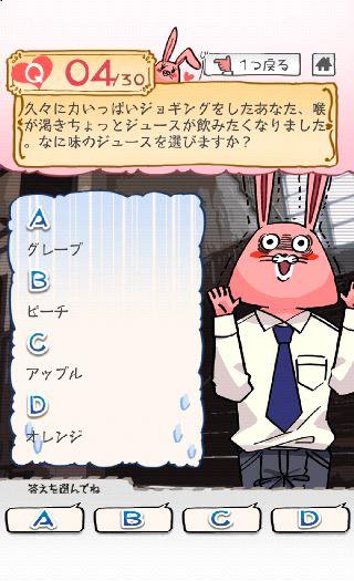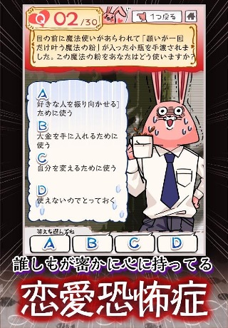 30問の心理テストを受けて、出された質問に適切だと思う解答(4択)の中から選んで答えていく。