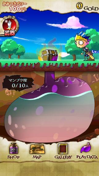 いろいろな勇者が画面右から歩いてくるので、まずは画面左上の『ナカミ』ボタンでお宝を選ぼう。