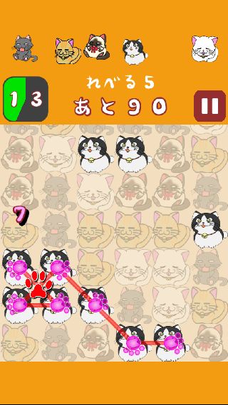 タテ・ヨコ・ナナメに同じ種類のねこを指でなぞって消していくシンプルルール。