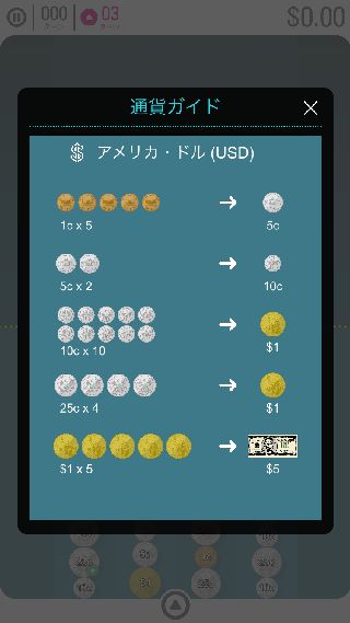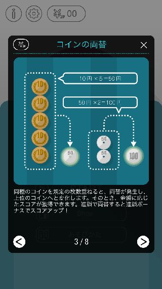 同じコインを規定の枚数重ねると、「両替」されて上位のコインへと変化する。