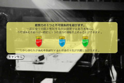 『不可侵条約』は外交コマンド。成立するとその国とは同盟になるが、成立には相手が弱小国である事が条件で、立場が逆転すると破られることも。