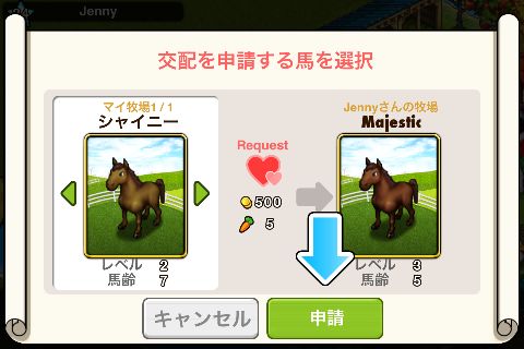 馬を選択して「交配申請」相手の馬のレベルや種類によって産まれてくる子馬が変わってくる。