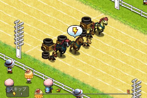 大会によってレース内容はタイヤを引っぱったり水中だったりと様々。基本、レース中は見ているだけだが、たまに表示されるアイコンをタップするといろいろなものがゲットできる。