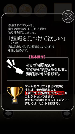 隠された鯉のぼりを探し出す、オーソドックスな脱出ゲーム。