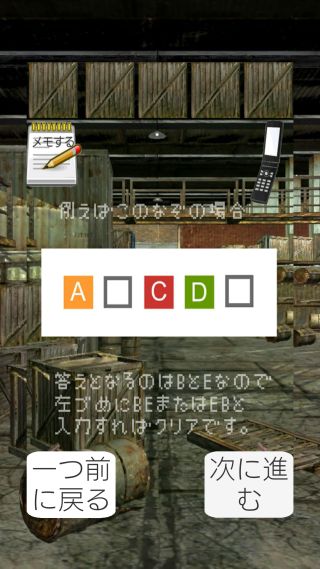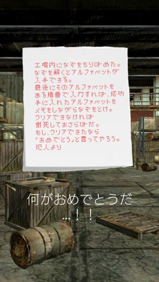 基本操作はタップのみで、工場内に仕掛けられた謎を解いて答えとなるアルファベットを入力する事でステージクリアとなる。