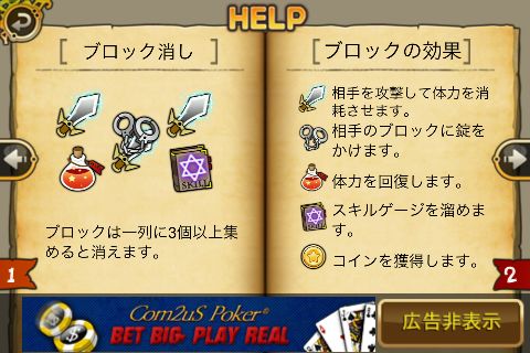 消すブロックにより敵への攻撃や体力の回復など様々な効果が発生する。