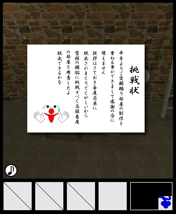 挑戦状がある部屋が舞台の、オーソドックスな脱出ゲーム。