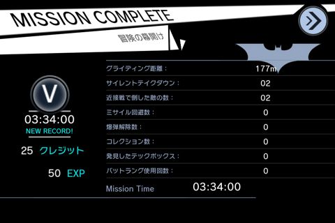 グライディングの様子です。ゴッサムシティを自由に飛び回れます。グラフィックが美しいので、グライディングするだけで楽しいです。ミッションをクリアすると、結果画面が表示されます。