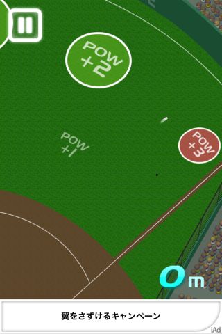 ボールを打つと、野球盤のようなゲーム画面になります。「POW」はホームランを打つために必要なのでなるべく狙いたいところです。また、スイングした後、画面をタップしたままにすることで飛距離がのびます。