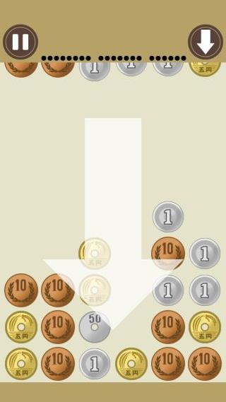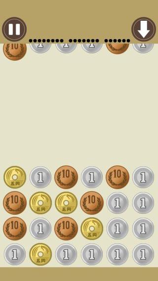 右上の『↓』ボタンを押すと、硬貨の落下を一列分だけ早める事ができる。