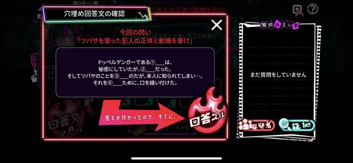 最終的に得た情報から、穴埋め回答文を埋める事ができればクリアとなる。
