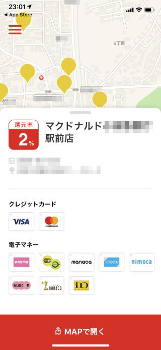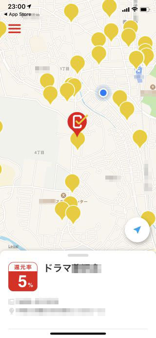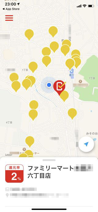 黄色いマークがポイント還元を受けられる店舗で、タップすると店舗名と還元率が表示される。