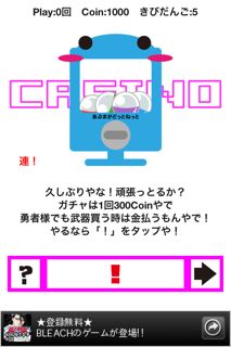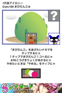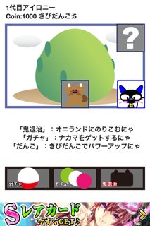 ゲーム内通貨COINを使って、ガチャを回します。ガチャでハズレをひくと、「きびだんご」をもらえます。アタリは仲間カードです。