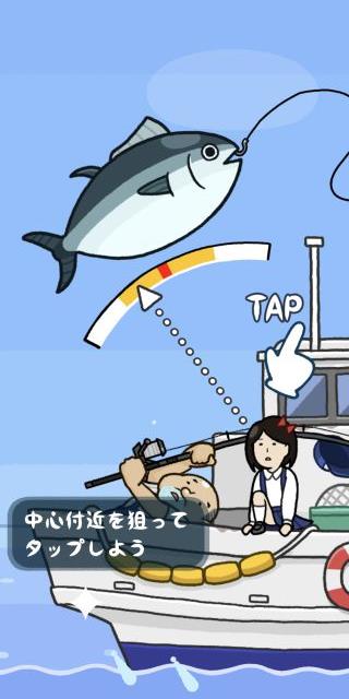 メーターが中心で止まるようにタイミングよくタップして、釣り上げたマグロに飛び乗ろう。