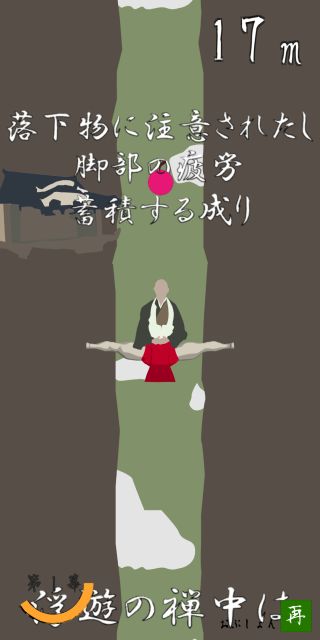 タップすると発動する"浮遊の禅"はすべての苦難に対し、無敵になるでしょう。これを使い徳を積み、股割僧をゴールへと導いてください。