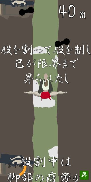 画面タップで股割で崖の上まで登っていく、シュールなカジュアルバカゲー。