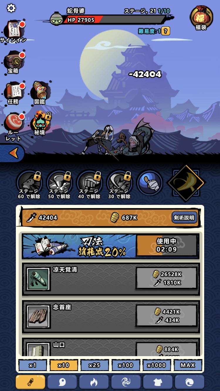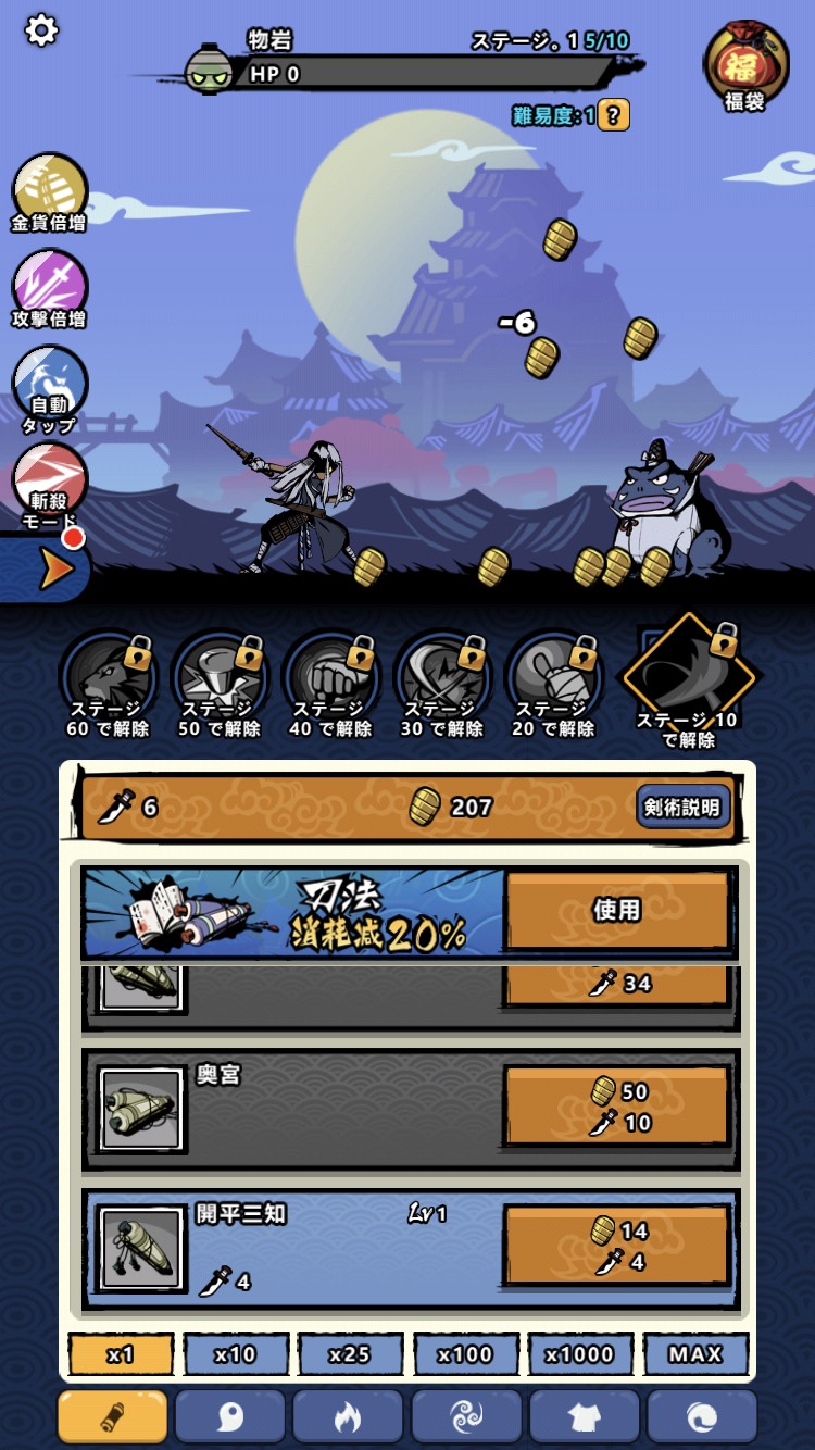 妖怪を次々と斬って斬って斬りまくる。そして小判を稼いでいく。