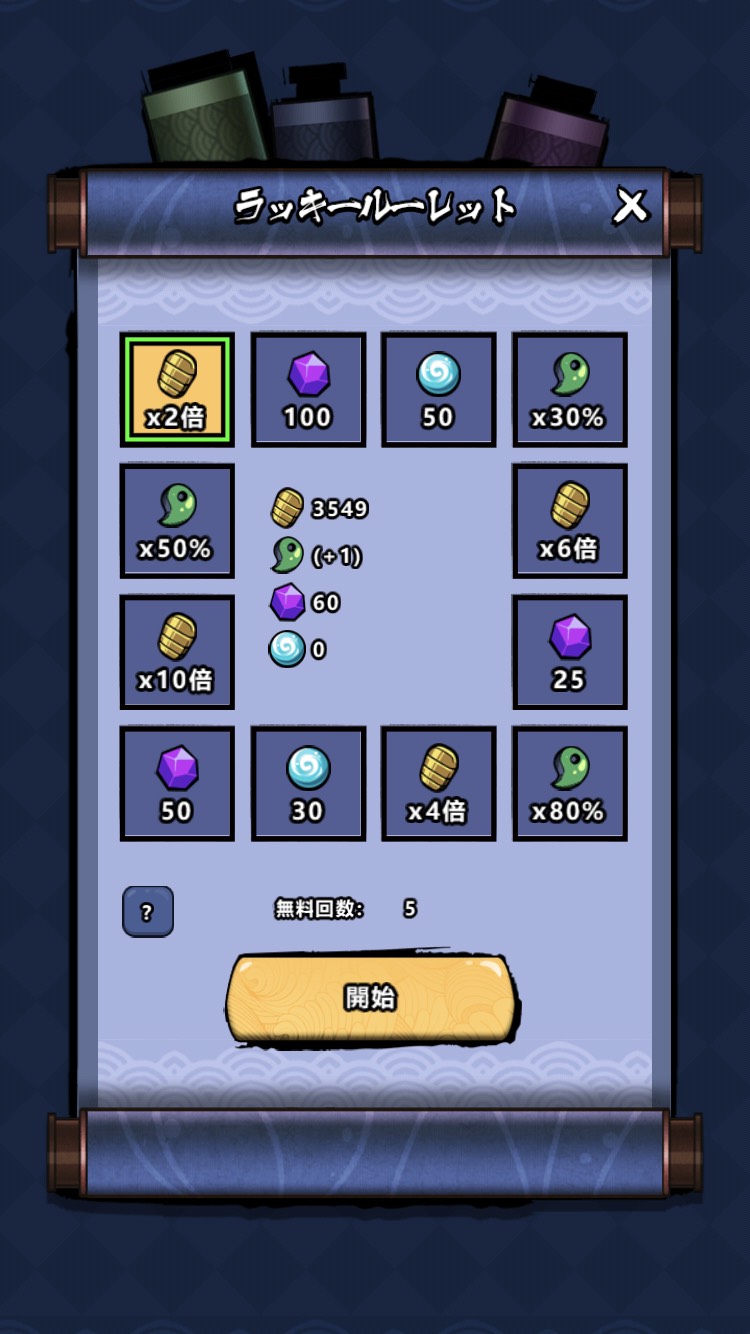 サムライは報酬などでもらえる青い宝石を使って強化したり、新たなタイプのサムライを使うことができる。