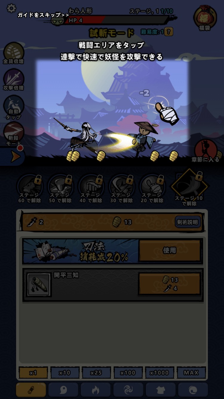 連続タップをすることで高速で敵を撃破することができ、武器のアップグレードでさらに効率よく妖怪を倒すことが可能。