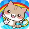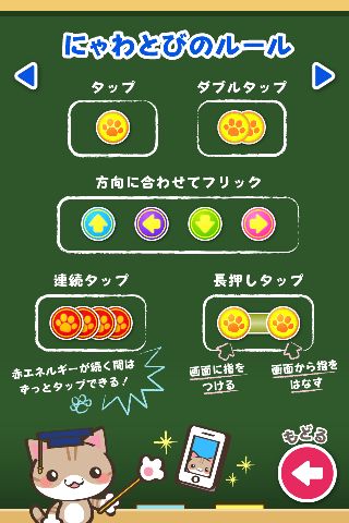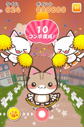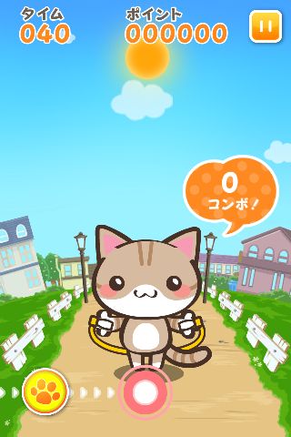 ゲーム画面。左から流れてくる肉球はタップ、矢印はフリックしていく。